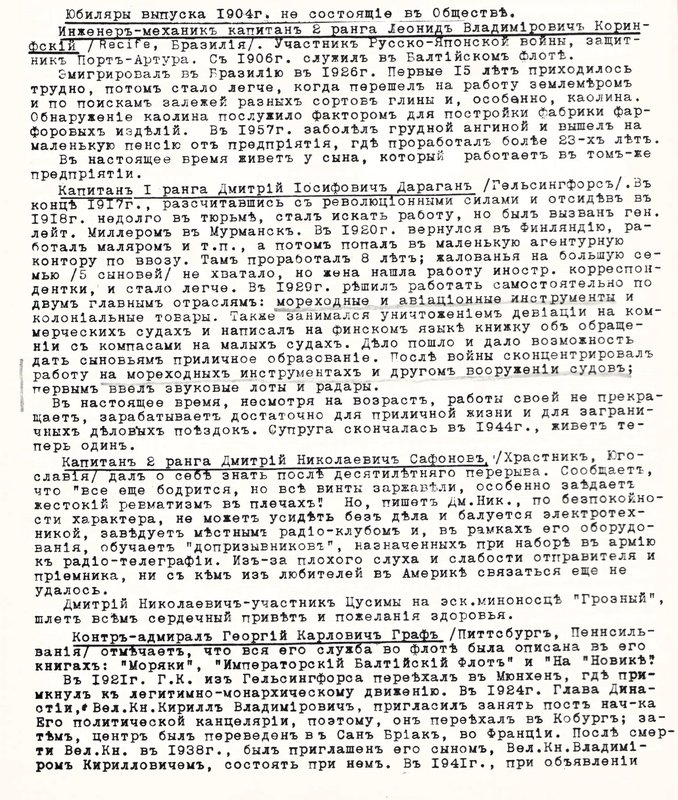Обнаружил фотографии (плохого качества) и/или краткие биографии о сложившейся жизни следующих офицеров выпуска 1904 г. - Коринфский Леонид Владимирович - Дараган Дмитрий Иосифович - Сафонов Дмитрий Николаевич - Граф Георгий Карлович - Фитингоф Оскар Брунович - Дворниченко Иван Павлович - Типольт Николай Александрович Если эти сведения еще нужны, напишите пожалуйста.