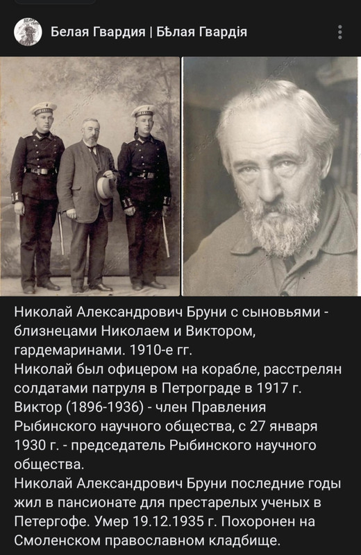 Братья близнецы? Интересно кот есть кто? БРУНИ Николай мичман Приказ по АиФ № 38 от 04.05.1917 г. Назначен на Дивизию траления Балтийского моря /Приказ КФБМ № 281 от 7.05.1917/ Зачислен для учёта в 1-й БФЭ /Цирк МШ от 310 от 10.10.1917/. БРУНИ Виктор окончил МУ 09.03.1918 года (в чин не производился) М.С. Стахевич Морской журнал № 58(10) 1932 г. С уважением Вл.
