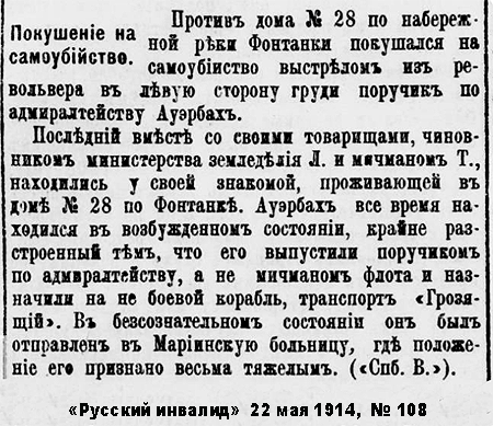 Подпоручик Ауэрбах, состоявший на ТР "Грозящий", 18.05.1914 был в 20 ч уволен в Кронштадте на берег, самовольно уехал в Петербург, где 19.05 в 3 ч ночи покушался на самоубийство, тяжело ранив себя в левую сторону груди; доставлен в Мариинскую больницу (РГАВМФ. Ф. 417. Оп. 2. Д. 1960. Л. 132, 134, 135). Сообщение пристава - РГАВМФ. Ф. 417. Оп. 2. Д. 1960. Л. 138-139. Ауэрбах был в гостях у жены инженера Стефанекевича (наб. Фонтанки 28) вместе с мичманом Владимиром Александровичем Штральборном и штатским В.Ф. Вицке; торопясь на ТР, который уходил 19.05, он в хорошем расположении духа простился, вышел на тротуар, вынул револьвер и выстрелил. Пуля прошла ниже сердца, пробила легкое, задела почку и прошла навылет. В гостях жаловался лишь на то, что его не перевели в мичманы. Протоколы дознания - Там же. Л. 142 - 145.