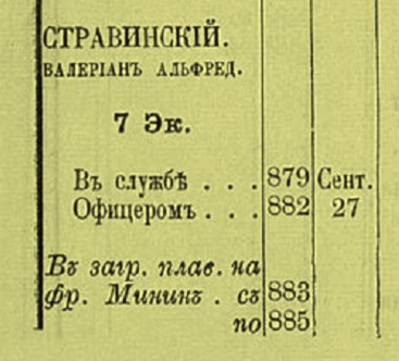 СТРАВИНСКИЙ Валериан Альфредович (01.06.1861–07.09.1893), лейтенант (01.01.1890). Из дворян Виленской губ., уроженец г. Архангельска. Окончил Морское училище (1876–1882), Артиллерийский офицерский класс (1886–1888). Мичман (27.09.1882). Служил на фрегате «Минин» (27.06.1883–27.10.1885, во внутреннем и заграничном плавании), батарее «Первенец» (1887, 1888). Заведующий приборами гальванической стрельбы на броненосце «Император Александр II» (с 26.10.1888), участвовал в достройке и испытаниях. Флаг-офицер при командующем Учебно-артиллерийским отрядом в кампаниях 1890 и 1891 гг. (приказы по Морскому ведомству от 31.03.1890 и 03.03.1891), в кампании плавал на батарее «Первенец». Учитель в школе Артиллерийских квартирмейстеров (с 24.09.1891); командир 5-й роты (с 18.11.1891); находился в плавании на броненосце береговой обороны «Русалка» (07.05–06.09.1892; 16.05–07.09.1893). Награды: орден Св. Станислава 3 ст. (01.01.1892).
