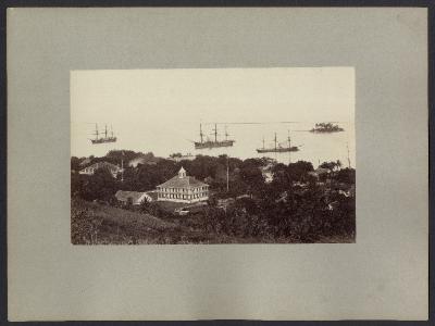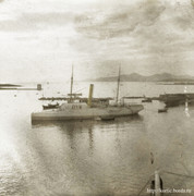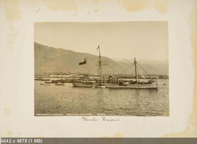 Французская Полинезия. Город Папеэте на острове Таити. Таити, Таити! Не были мы ни на какой Таити! Нас и здесь неплохо кормят... В центре непонятно что - малый броненосец, броненосец 2-го касса, броненосный крейсер для колониальной службы - Victorieuse (1877) типа La Galissonniere. La Galissonniere (1874) не имел полубака. Triomphante (1879) тоже нет. Справа - авизо типа Bisson - Bisson (1875), D.d'Urville (1879), Chasseur (1879), Hussard (1878), Labourdonnais (1876), Voltigeur (1879). Кто конкретно, не знаю. По походам - глухо, тёмный лес. Помогите, кто сможет. Слева - английский батарейный корвет, предположительно тип Amethyst. Надо ещё подумать. Есть ещё претенденты - тип Volage и тип Emerald.